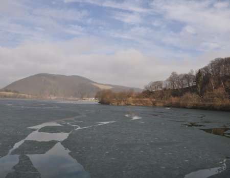 Beginnen kann man den Diemelsteig z.B. an der Staumauer des Diemelsees in Helminghausen. Die Staumauer, ein gewaltiges Bruchsteinbauwerk, das 36m hoch ist, liegt übrigens auf nordrhein-westfälischem Boden. Aber schon bald erreicht man hessisches Gefilde. Zunächst geht es aber hinauf auf den Eisenberg (595m). Der Anstieg wird mit vielen Aussichtspunkten versüßt, die immer wieder einen faszinierenden Blick auf den Diemelsee freigeben.