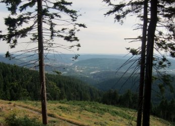 Gen Nordwesten wandern wir weiter und biegen nach etwa 450 Metern nach rechts auf einen Weg ab, der uns auf die Höhe des Großen Finsterberges (944m) führt. Hier oben befindet sich auch die Aussichtsplattform Schmiedefelder Blick und der Aussichtsturm Großer Finsterberg. In der Finsterberghütte, die nicht weit vom Turm entfernt steht, können wir auf eine Rast einkehren.