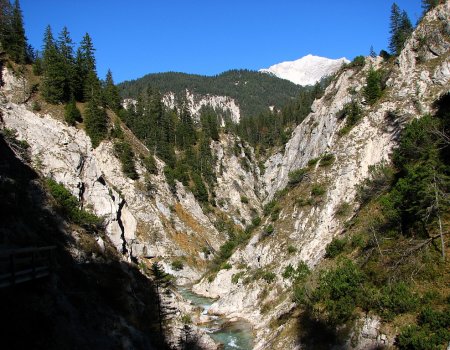 Die Gleirschklamm mit dem Gleirschklammweg ist ein wunderbares Naturereignis, wofür es Steigerfahrung und Trittsicherheit braucht. Die Wege durch die wildromantische Klamm sind teils ausgesetzt und seilversichert. Da kann es auch schon mal spannend schroff bergab gehen. Der Nederweg führt entlang der Isar, mit Brückchen und teils versandenten Wegen geht es durch die Schlucht der Gleirschklamm. Oberhalb des Gleirschbachs wandern wir durch Wald an die Isar hinab und zum Ausgangsort, südöstlich von Scharnitz, zurück.
