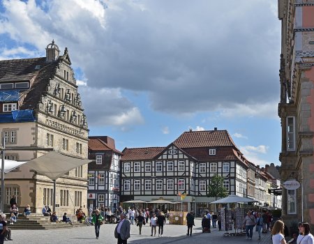 An der Kreuzung Wilhelmplatz wanderst du auf der Bismarckstraße bis zur B 1, dem Osttorwall weiter. Auf der anderen Straßenseite steht vor dir das ehemalige Rittergut Redenhof Hameln. Das historische Gebäude stammt in etwa aus dem 16. Jahrhundert. Folge nun ein paar Minuten der Bundesstraße bis zur Bäckerstraße. Diese führt dich in nördlicher Richtung durch die Altstadt mit ihren vielen kleinen Cafés und Geschäften.