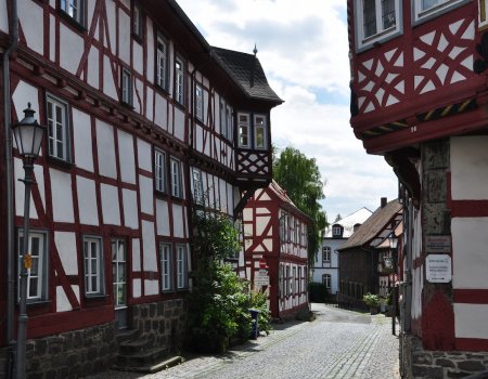 Wer jetzt die Kirche rechts liegen lässt und weiter der Kirchgasse folgt, kann zahlreiche weitere hübsche Fachwerkbauten sehen, die Besonderheiten haben, wie das Haus mit der Nummer 6. Hier ist ein Augenmerk auf den Sockel zu richten, der Kreuzstein darin soll einem älteren Sakralbau entstammen. Die Kirchgasse stößt auf die Braugasse - erst beten, dann brauen oder Bier trinken - hier steht eines der ältesten Häuser von Lich, der Frankfurter Hof mit einem Kern aus dem 14. Jahrhundert.