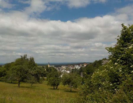Hier am Eckstein halten wir uns links und wandern bis zur nächsten Kreuzung, an der wir ebenfalls wieder links abbiegen. An der nächsten Kreuzung angekommen, geht es nach rechts und aus dem Wald heraus. Bald darauf passieren wir das Schützenhaus und wandern dann nach links und über einen schönen Wiesenweg zurück zum Startplatz.
