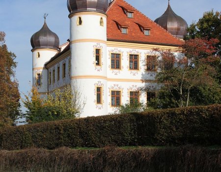 Jetzt folgen wir der Betriebsamkeit nach Markt Wald aufwärts und treffen dort auf das Schloss Markt Wald am Westhang des Neufnachtales. Es scheint wie aus einem Märchen aufgetaucht, mit den glänzenden Kuppeln auf den Türmen, auf denen gusseiserne Geweihe stecken. Das ehemalige Schloss und die später Fürstlich Fuggersche Oberförsterei geht auf einen Vorgänger von 1525 zurück. Was man sieht, stammt aus den Jahren 1747/48. Hübsch sind auch die Malereien um die Fenster.