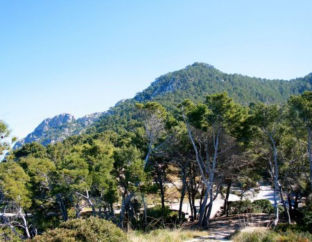 Kurz drauf machen wir vom Weg einen kleinen Abstecher zu den Ses Tres Creus, mit den aufgestellten Kreuzen und Blick durch die Bäume in die Bucht. Durch Wald wandern wir immer weiter hinauf, kommen über den Coll des Pedregaret (316m). Wenn die Landschaft karger und felsiger wird, wandern wir über den Pla de sa Talaia und Pas de s’Artija (319m). Wir sind kurz vor dem höchsten Punkt: Talaia d’Alcùdia, dessen Gipfel mit 446m angegeben ist und wo wir einen Abstecher hinauf machen können, um den wundervollen Rundumblick zu genießen.