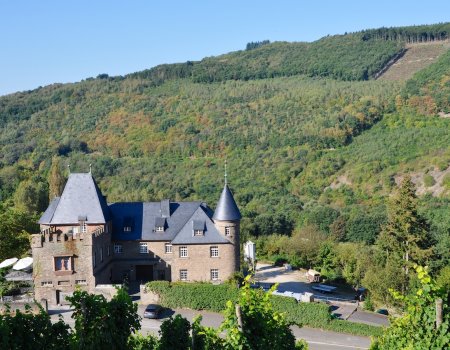 Unterhalb von Schloss Marienlay kreuzen wir die Kreisstraße K 65 und wandern auf einem Felsenpfad vorbei an Schieferbrüchen zurück zum Saar-Hunsrück-Steig. Durch eine alte Weinberganlage mit schönen Aussichtspunkten wandern wir auf dem Saar-Hunsrück-Steig zurück zum Startpunkt unserer Rundtour.