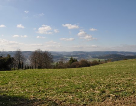 Um Simmersbach herum führt der Uplandweg weiter über den Kurzbeul (566m) in den Segelfliegerort Hirzenhain. Die großen Maschinen fliegen heute am anderen Ende von Hirzenhain, an der Fliegerhalle am Kurzbeul lassen aber immer noch die Modellflieger regelmäßig ihre Flieger Bahnen durch die Luft ziehen. Und man hat von hier oben einen wirklich beeindruckenden Blick in die weite Tallandschaft, die wir eben durchwandert haben.