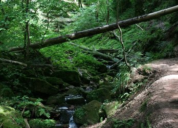 Wir kommen in die Wolfsschlucht (auch Wolfschlucht geschrieben). Kurz und mit Gefälle kommt das Schlossbächlein durch ein rund 1km langes Kerbtal, bevor es wenig später in den Neckar mündet. Das Wasser hat eindrücklich den Buntsandstein ausgewaschen und Brocken hinterlassen. Bisweilen liegen Stämme kreuz und quer, als sollte das Zitat des Wiener Arztes und Dramatikers Arthur Schnitzler (1862-1931) bebildert werden: „Ordnung ist etwas Künstliches. Das Natürliche ist das Chaos.“