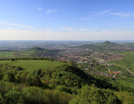 Bei der Höhengaststätte Jahnhaus gehen wir an den Sportstätten vorbei und verlassen die Stadtbebauung hinter uns. Aufwärts zum Schönberg kommen wir an dem Vorderen Sättele (682m) und dem Hinteren Sättele (721m) vorbei, zum 825m hohen und markanten Felsen Wackerstein mit Aussichten, Gipfelkreuz und der Wackersteinhöhle. Der Blick fällt ins Albvorland und auf die Berge des Albnordrands bis hin zum Schwarzwald.