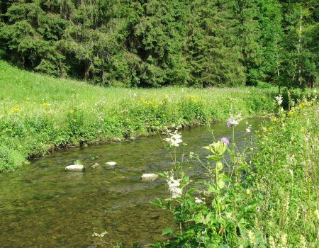 Gegen den Uhrzeigersinn geht’s durch die Felder und mit der Oberen Argen entlang dem Westallgäuer Wasserweg 21. Stiefenhofen, der Nagelfluhkette vorgelagert, ist eine Gemeinde im Landkreis Lindau und anerkannter Erholungsort, nebst rund 100 Landwirtschaftsbetrieben. Touristisch hat sich Stiefenhofen den Kräutern verschrieben, im Ortsteil Hopfen (südwestlich unserer Runde) ist beispielsweise der Naturgarten „Artemisa“ mit allerlei Angeboten zu Kräutern (Gärtnern, Kochen, Lernen).